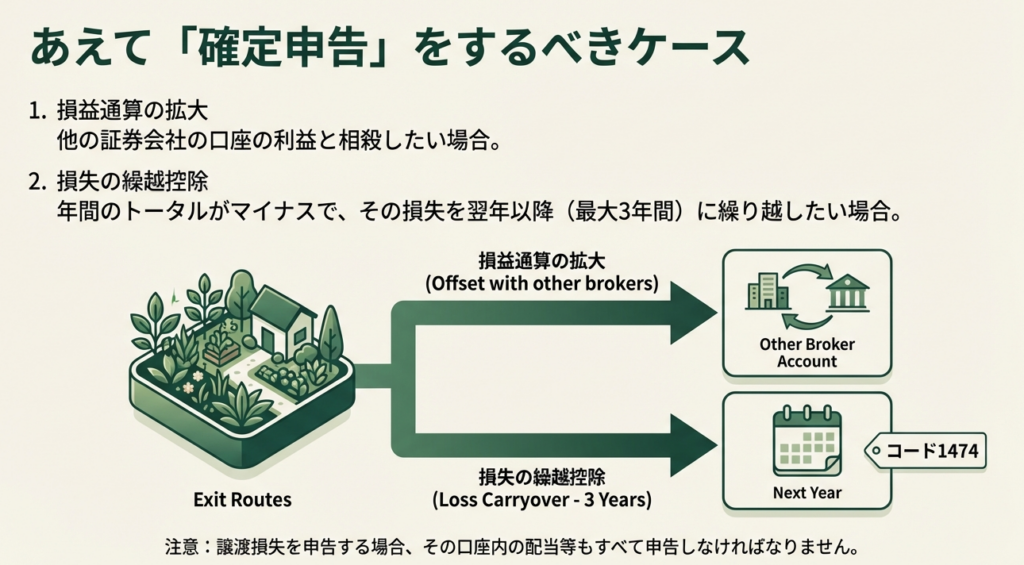源泉徴収口座の最大のメリットは「申告不要」を選択できる点にあります。しかし、スタッフの皆さんに意識してほしいのは、「あえて確定申告を選択すべきケース」の見極めです。他口座での損失と相殺したい場合や、過去の損失を繰り越したい場合は申告が必要になります。