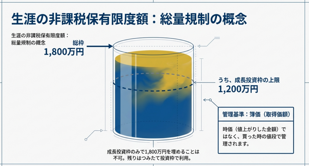 非課税保有限度額は、全体で1,800万円までとされています。その内数として、成長投資枠(特定非課税管理勘定)のみで利用できる上限額は1,200万円に設定されています。