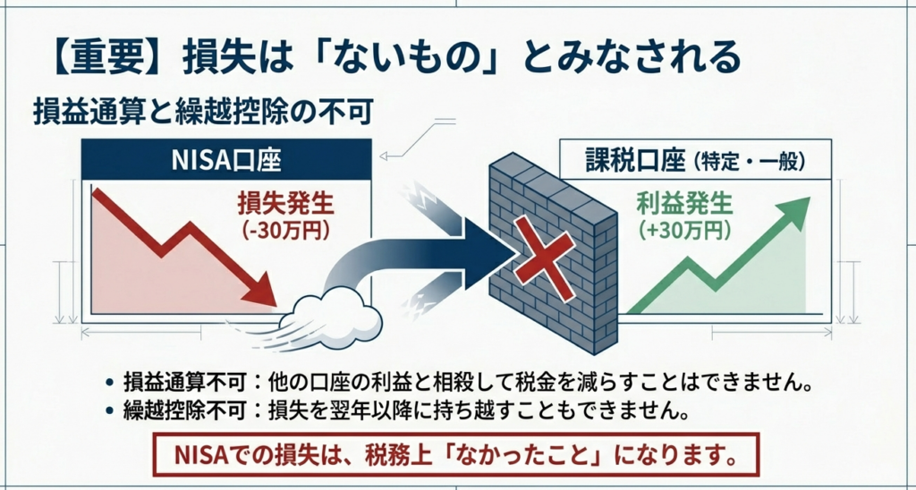 注意点として、NISA口座で生じた売却損は税務上「ないもの」とみなされるため、特定口座や一般口座の利益との損益通算や、損失の繰越控除は一切できません。