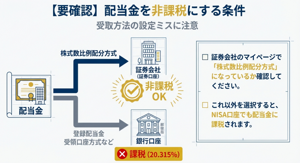 顧問先が、1つでも他の証券口座等で「登録配当金受領口座方式(銀行受取)」や「配当金領収証方式(郵便局等受取)」を選択していると、その設定が全口座に適用され、NISA口座の配当金も課税対象になってしまいます。