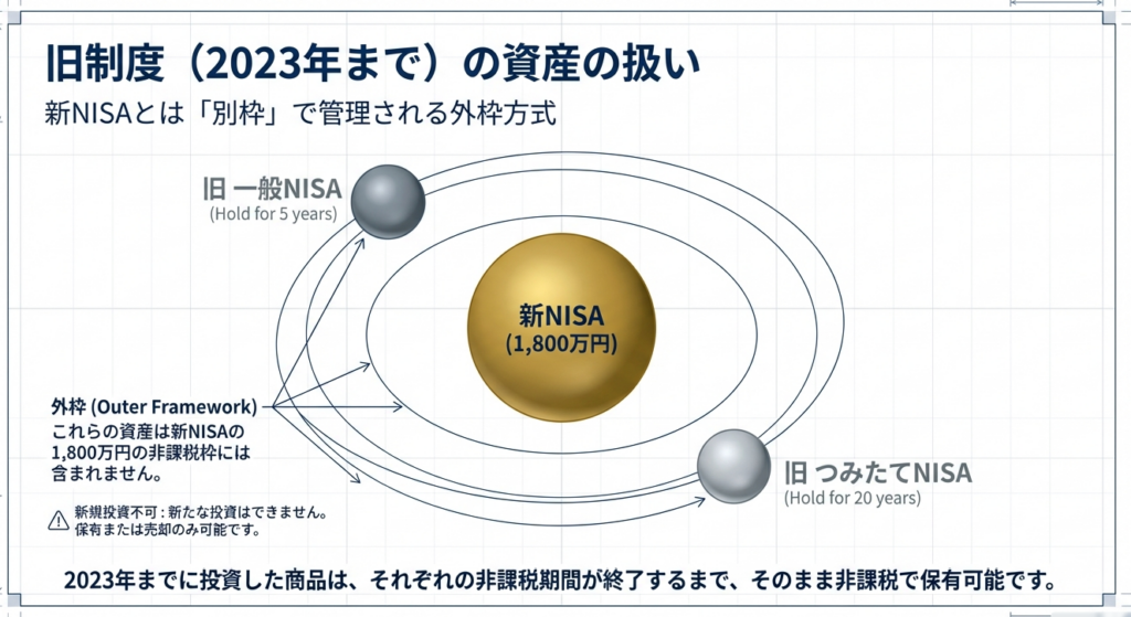 旧NISA制度(一般・つみたて)で投資した商品は、2024年以降の新しいNISA制度の外枠として扱われます。そのため、新制度の非課税保有限度額とは別枠で、引き続き旧制度の規定に基づく非課税期間が維持されます。
