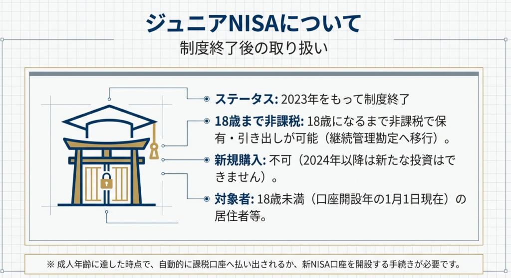 口座開設の年の1月1日現在で18歳未満の方が対象でしたが、令和5年末で新規投資は終了しています。