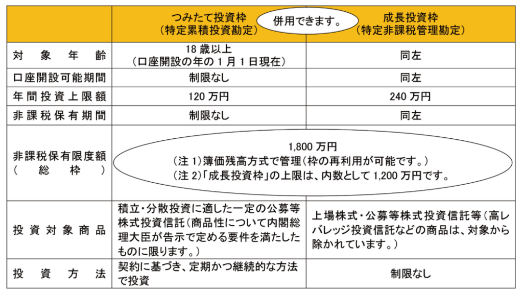 令和6年以降の新しいNISA制度では、18歳以上を対象に、つみたて投資枠(年間上限120万円)と成長投資枠(年間上限240万円)で取得した上場株式等の配当等や譲渡益が非課税となります。