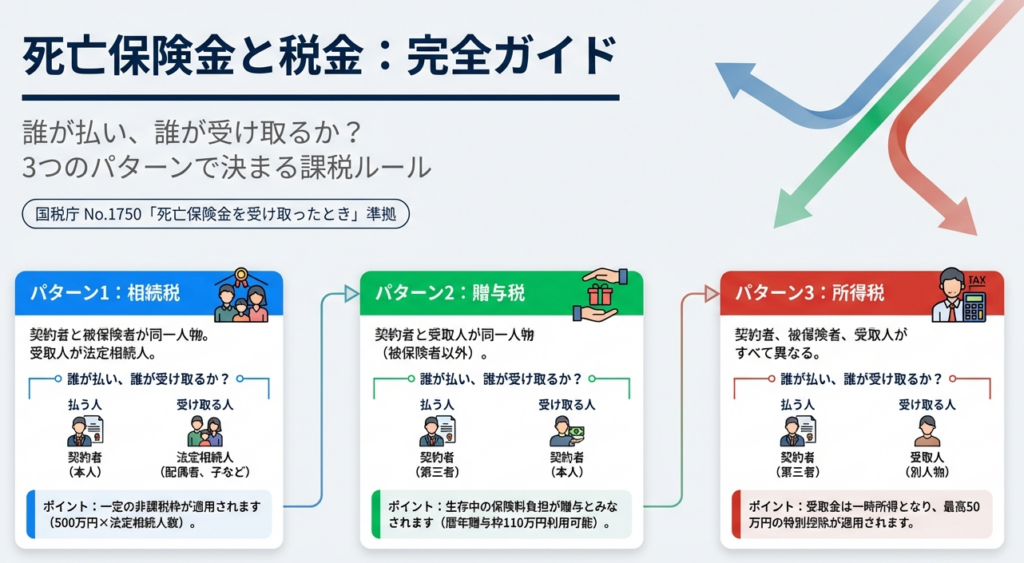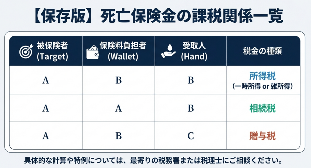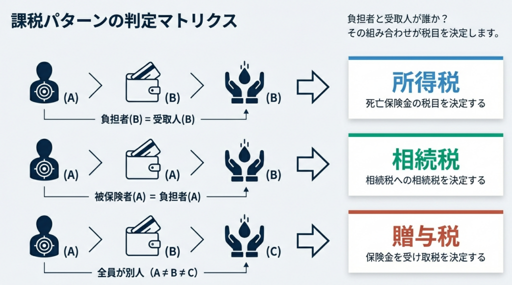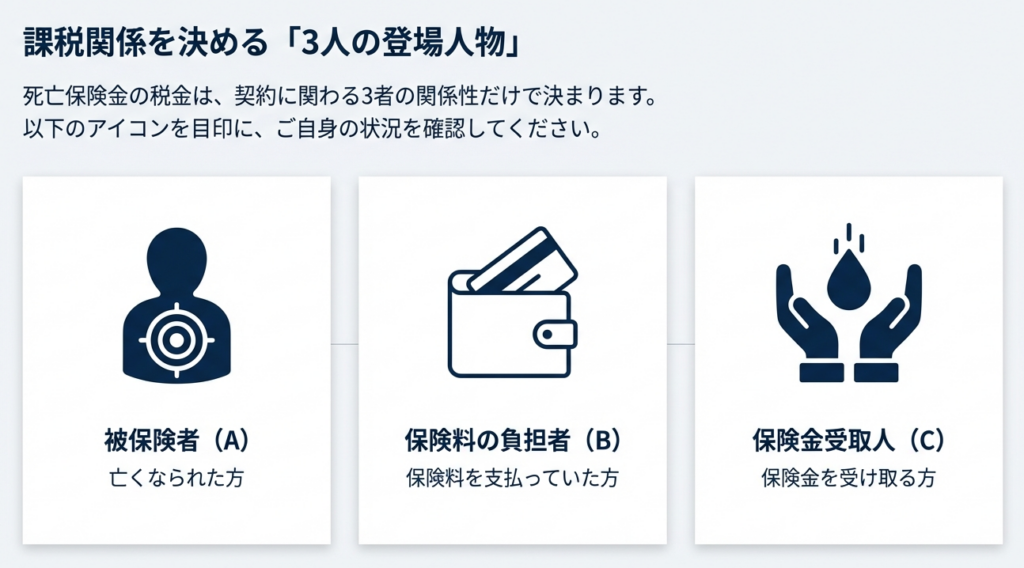 課税関係を決定付ける絶対的な基準は、「被保険者」「保険料負担者」「受取人」の三者の関係性です。実務においては、まずこの資金の流れを特定することが全ての出発点となります。