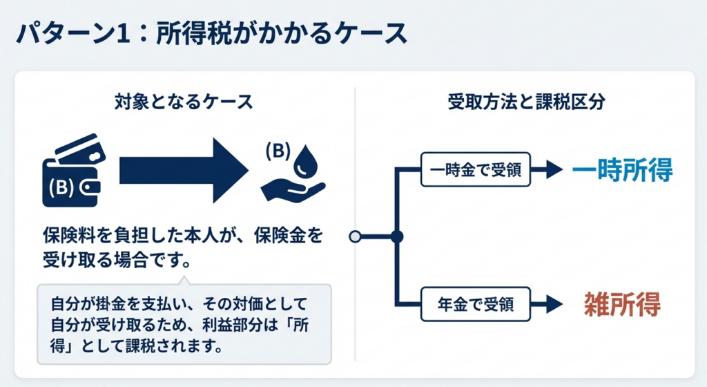 1. 所得税:保険料の負担者と保険金受取人が同一の場合です。一時金で受け取ると「一時所得」、年金で受け取ると「雑所得」として課税されます。