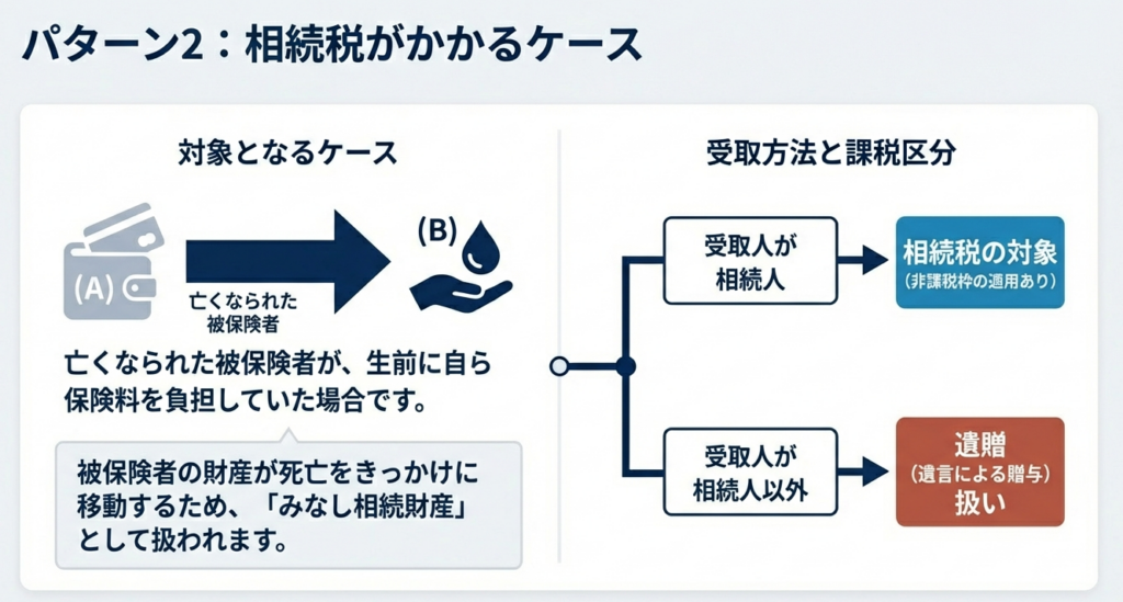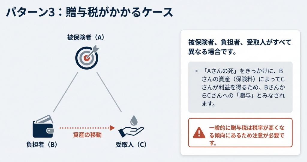この場合、保険料負担者から受取人への資産の移転とみなされるため、贈与税が課税されます。例えば、父が被保険者、母が保険料負担者、子が受取人というケースがこれに該当します。