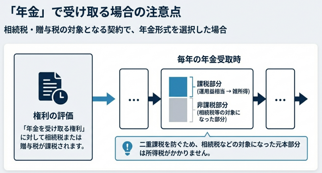 年金形式で受け取る場合、まず「年金を受け取る権利」に対して相続税・贈与税が課税されます。その後、毎年支払われる年金には所得税がかかりますが、ここで「二重課税」を防ぐための調整が必要になります。具体的には、収入金額を「非課税部分(既に相続税等の対象となった部分)」と「課税部分」に振り分けて計算します。