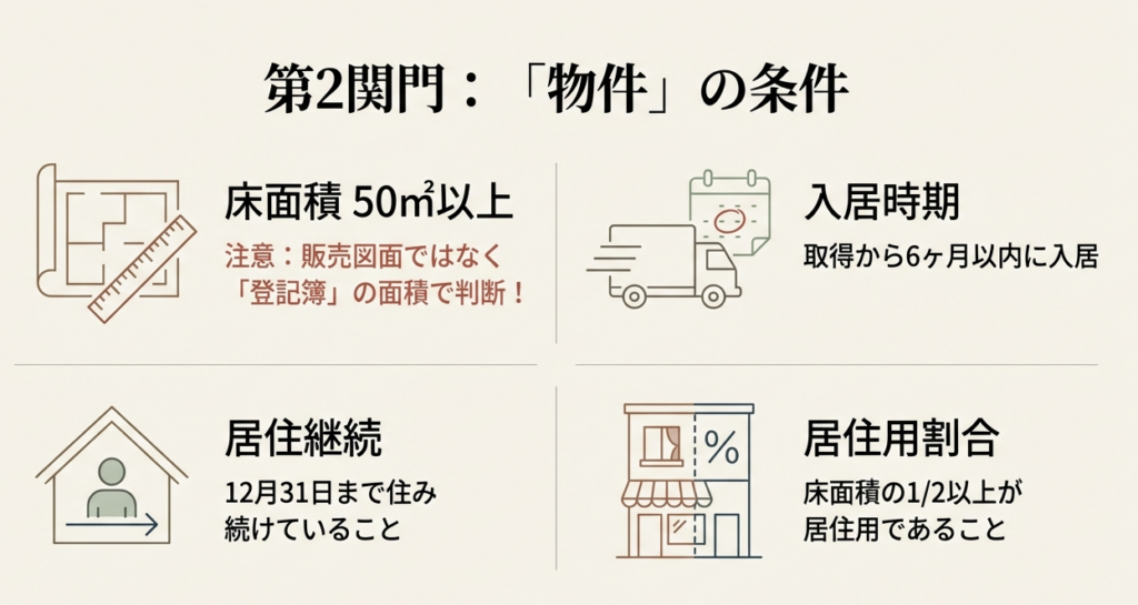 住宅の床面積が50平方メートル以上であり、かつその床面積の2分の1以上を専ら自己の居住のために使用している必要があります。マンションの場合は、共用部分を除いた専有部分の面積で判断されます。