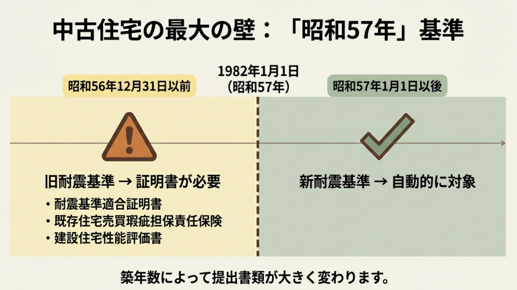 原則として昭和57年1月1日以後に建築されたものである必要があります。これ以前の建築であっても、取得日前2年以内に耐震基準適合証明を受けた「耐震住宅」であるか、入居までに耐震改修を行い基準に適合した場合は対象となります。