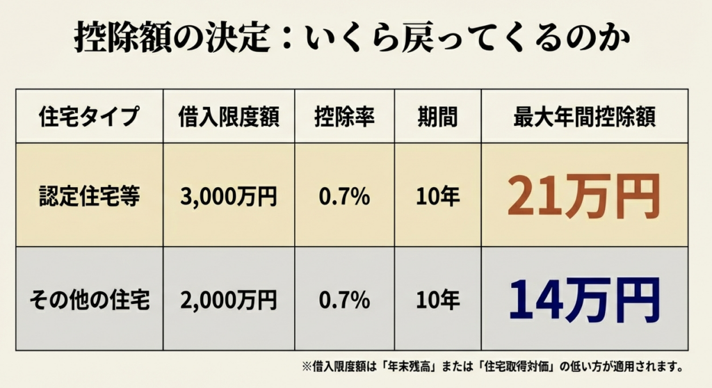 認定住宅等(認定住宅、ZEH水準、省エネ基準適合住宅)の場合、借入限度額に基づく各年の控除限度額は21万円です。一方、これらに該当しない「その他の住宅」の場合は、各年の控除限度額は14万円となります。