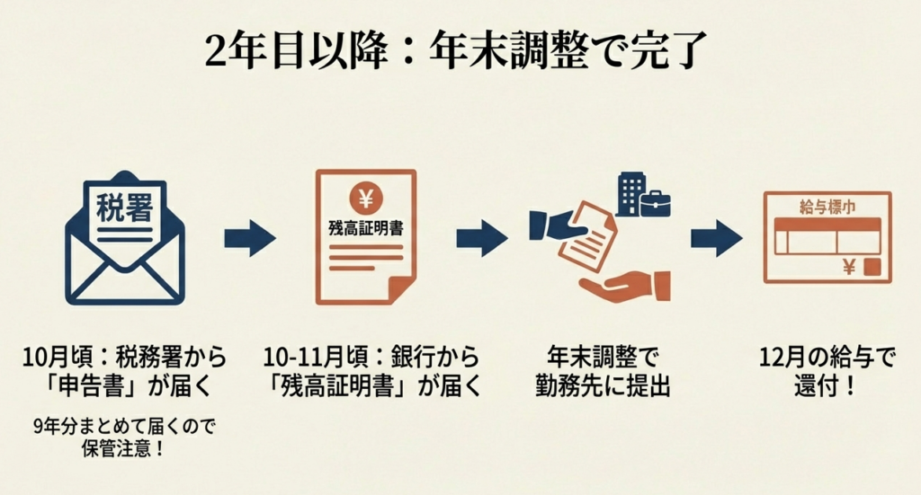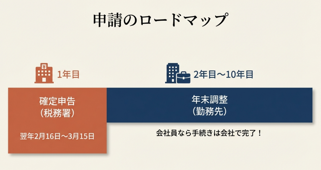 手続きとして、1年目は税務署への確定申告が必要ですが、会社員であれば2年目以降は年末調整で控除を受けることができます。