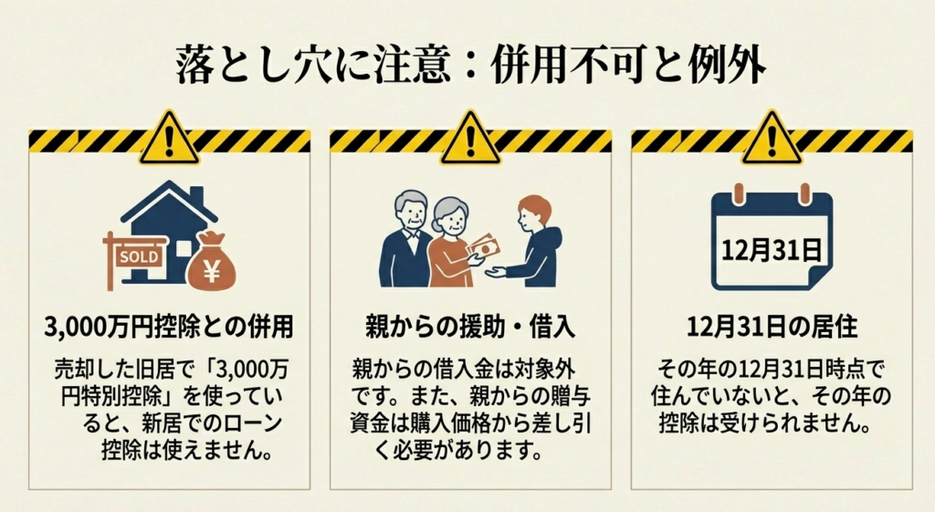 居住年とその前後計6年間に、居住用財産の3,000万円特別控除等の適用を受けている場合は、ローン控除を適用できません。
