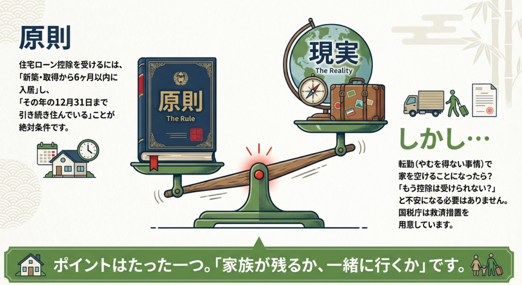 周知の通り、この控除は「12月31日時点で本人が居住していること」を原則としています。しかし、転勤という抗いようのない事由が発生した際、この原則が大きな足かせとなります。
