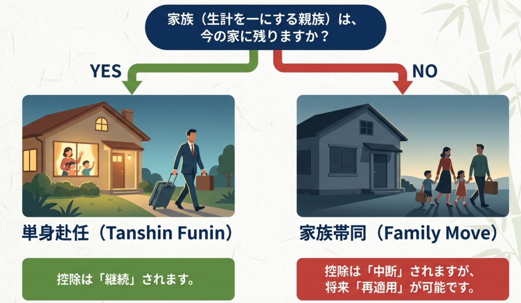 実務上、転勤時の対応は「誰が残り、どのような所得があるか」で決まります。まずは、以下の判断マトリックスを頭に叩き込んでください。