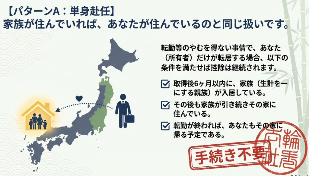 原則として入居し続けることが控除の要件ですが、単身赴任等で家族がその住宅に引き続き住む場合は、本人が住んでいるものとみなされ、引き続き控除を受けられます。