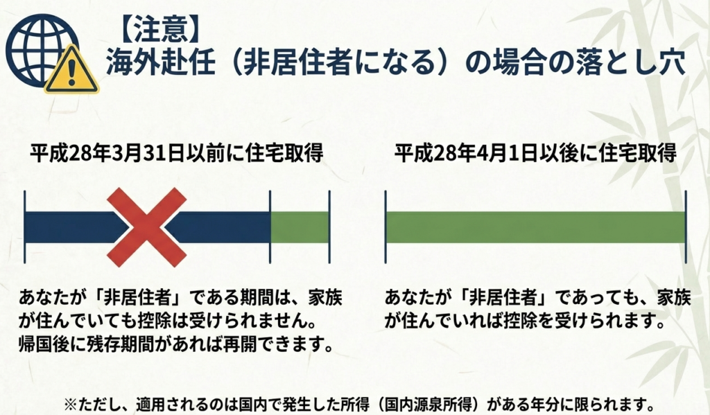 制度の適用対象者が「居住者」に限られているため、国外転勤による非居住者期間中は適用がありません。ただし、帰国後にその家屋に親族と共に居住し、年末まで引き続き居住した場合には、残存控除期間について適用を受けることができます。