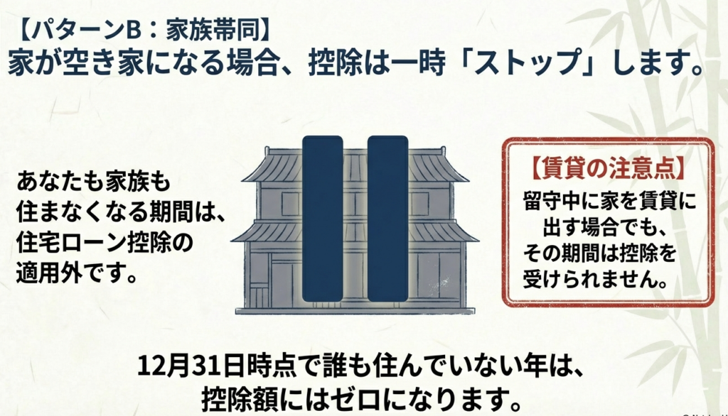 一方、家族全員で引っ越して誰も住まなくなった場合、その期間の控除は受けられなくなります。しかし、転勤等のやむを得ない事情であれば、将来マイホームに戻って再び住み始めた年から、**残りの期間について控除の「再適用」**を受けることが可能です。