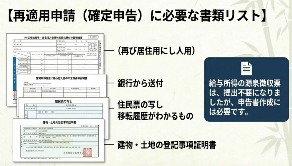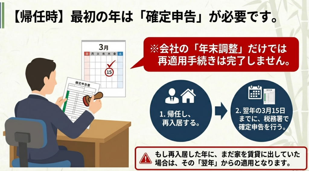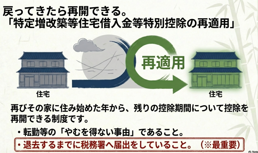 注意点として、住んでいなかった期間の分だけ控除期間が延長されるわけではありません。また、再適用を受けるには、引っ越し前(居住しなくなる日まで)に税務署へ所定の届出書を提出し、戻ってきた年に確定申告をするなどの手続きが必要です。
