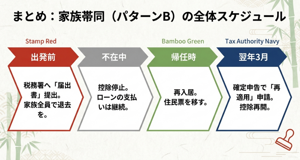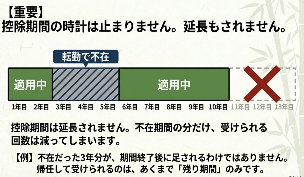 | 2. 家族全員で転居(将来再居住) | 再居住時から再開 | 出国中は停止。戻った後の「残存期間」のみ再適用。事前の届出が必須。 |