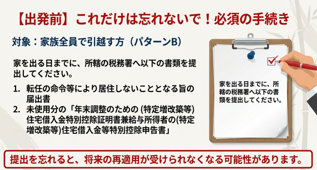 居住の用に供した年の12月31日までに家族と共に転勤等で転居する場合、その家屋を居住の用に供しなくなる日までに必要な手続きは特にありません。再入居時に必要な書類を添付して確定申告を行うことになります。