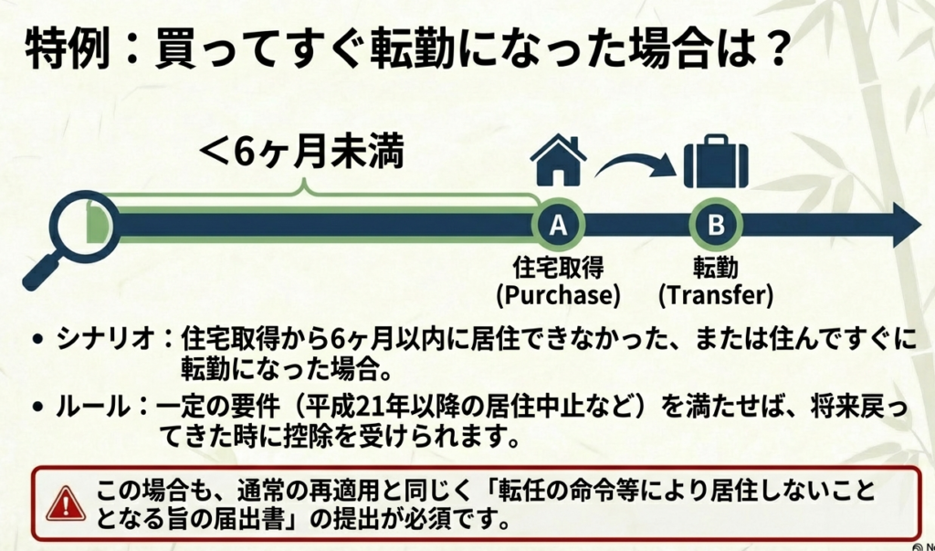 | 3. 入居前に転勤命令 | 条件付きで適用可 | 家族が6か月以内に入居すればOK。事前の届出は不要だが、帰国時に証明が必要。 |
