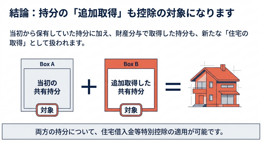 財産分与によって共有持分を追加で取得した場合、控除の適用においては「新たに家屋を取得したもの」として扱われます。したがって、追加取得の際に一定の住宅ローンを利用するなどの要件を満たしていれば、「当初から保有していた持分」と「新たに追加取得した持分」のいずれについても控除の適用を受けることが可能です。
