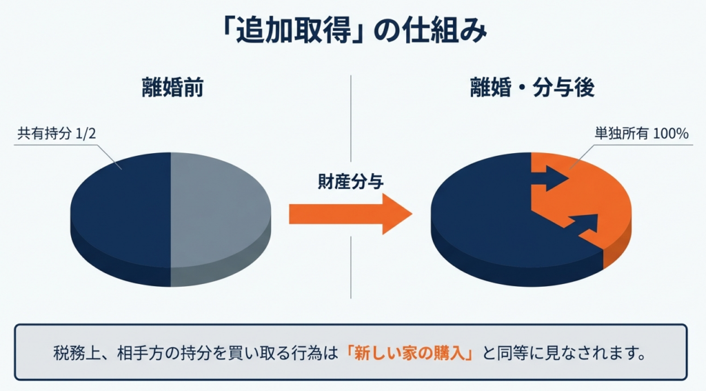財産分与による共有持分の追加取得は、住宅借入金等特別控除の適用上、新たに家屋を取得したものとして扱われます。これにより、既存の持分と新たな持分の両方が控除の検討対象となります。