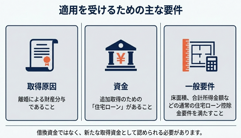 追加取得した共有持分に係る一定の住宅借入金等の金額を有していることが必要です。また、その他の住宅借入金等特別控除の標準的な要件も満たしていなければなりません。