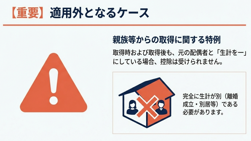 注意点として、取得時およびその後も生計を一にしている親族等からの取得は控除の対象外となります。