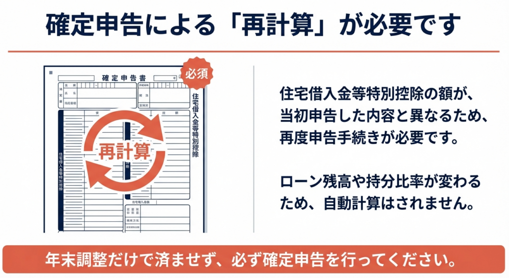 住宅ローン控除の額が、当初の確定申告で申告した内容(持分割合など)から変更になるため、再度、確定申告(還付申告等)が必要になります。