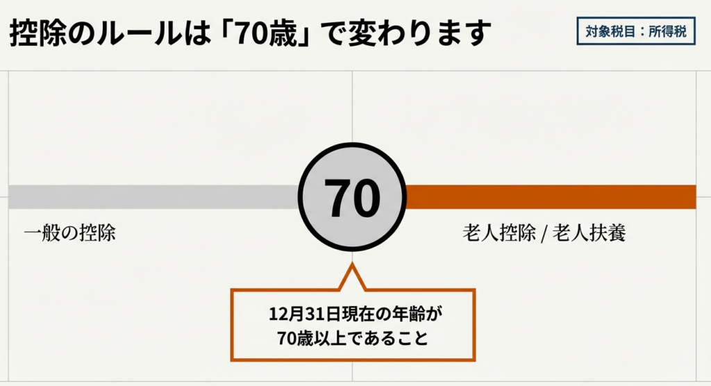 対象となる配偶者や扶養親族の年齢は、その年の12月31日現在の年齢が70歳以上である必要があります。この年齢基準を満たすことで、老人控除対象配偶者または老人扶養親族としての区分が適用されます。