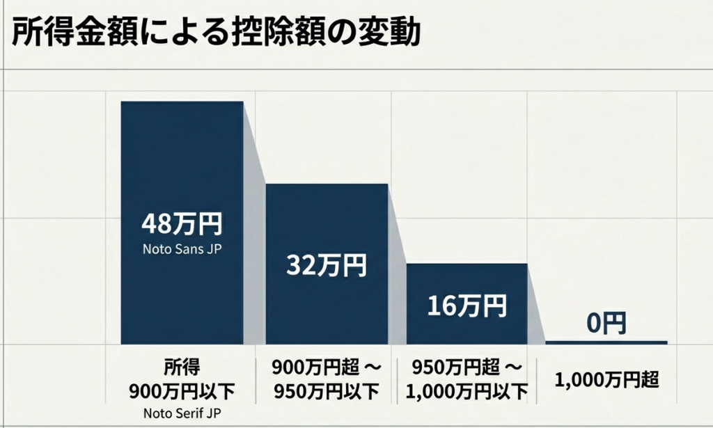 納税者本人の合計所得金額が900万円を超えると、控除額が段階的に減少することに注意が必要です。