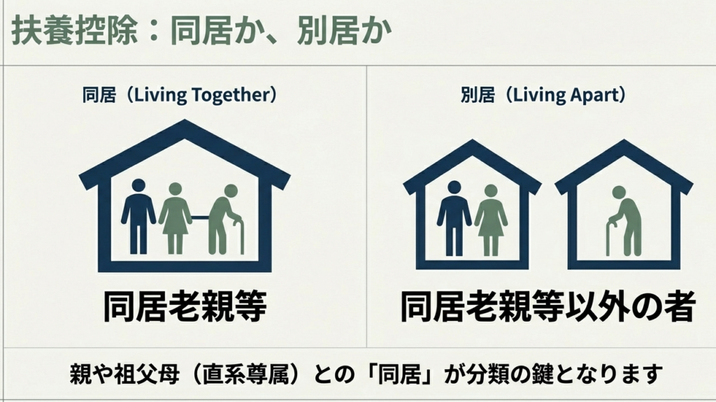 老人扶養親族の控除額は、その親族との「同居の有無等」によって区分されます。同居しているか、あるいは同居していないかによって、適用される控除額に10万円の差が生じます。