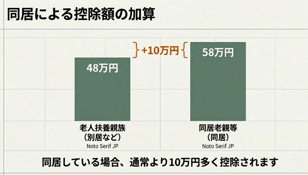 同居を常況としている「同居老親等」に該当する場合、控除額は58万円となります。これは、同居していない老人扶養親族の控除額(48万円)よりも10万円高く設定されています。