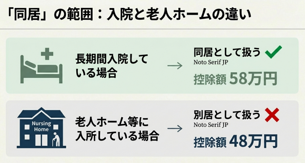 「同居老親等」とは、納税者本人またはその配偶者の直系尊属(父母・祖父母)を指します。「配偶者の両親」であっても、同居していれば58万円の控除が適用できる点は、若手スタッフが見落としやすいポイントです。また、病気療養のため長期間入院している場合は「同居」として継続して扱えますが、老人ホーム等へ入所した場合は原則として「別居」扱いとなります。この「入院か、施設か」という事実は、ヒアリングなしには判明しません。