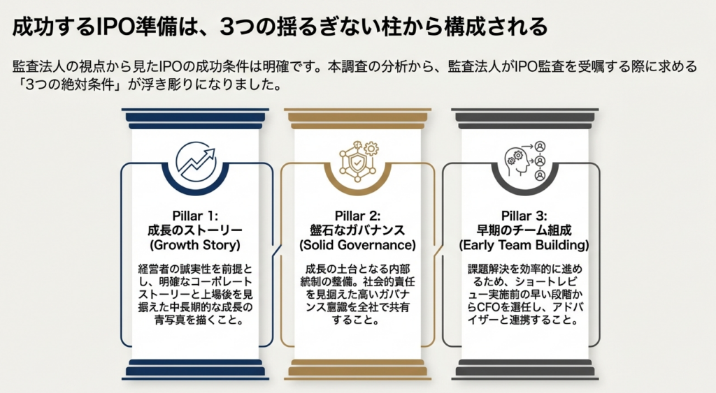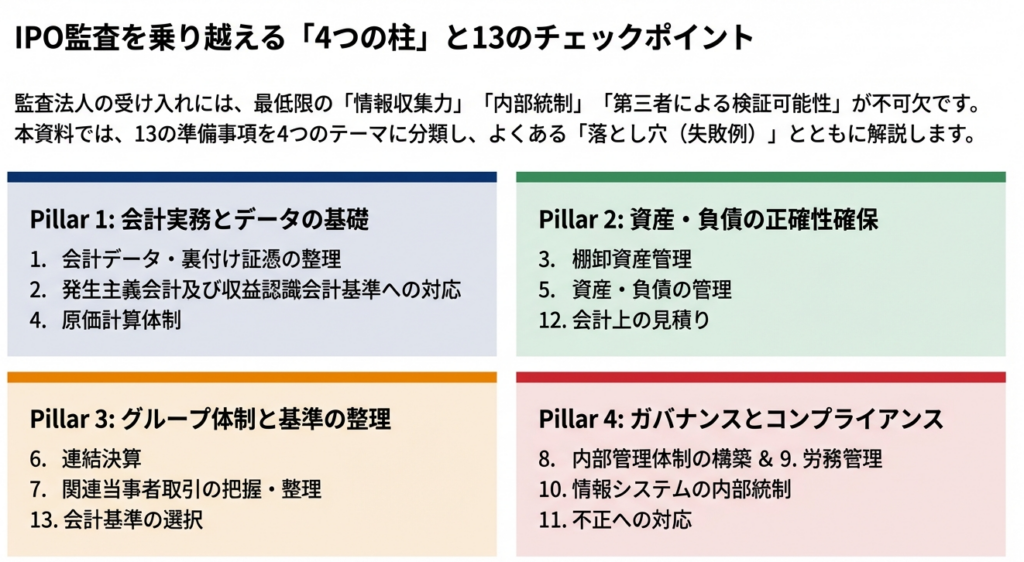 ガイドブック第V章に基づき、IPO準備の成否を分ける4つの柱を専門的な視点から深掘りします。
