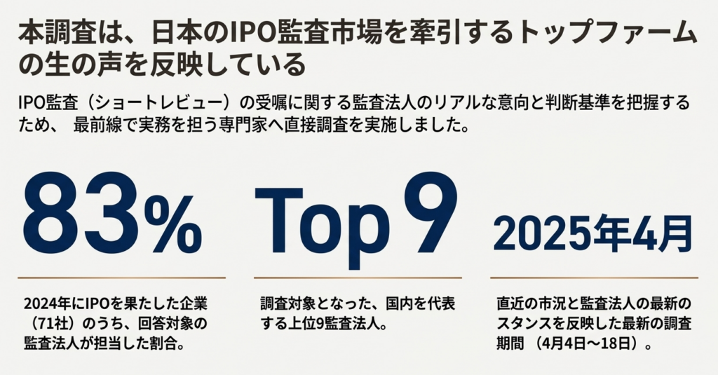 2025年に実施された最新アンケート(上位9監査法人対象)の結果を読み解くことは、監査法人が内包する「リスク許容度」と「期待値」という名の手の内を明かすことに他なりません。