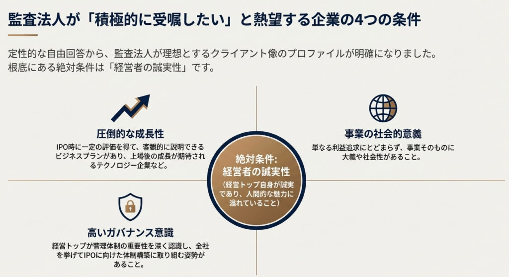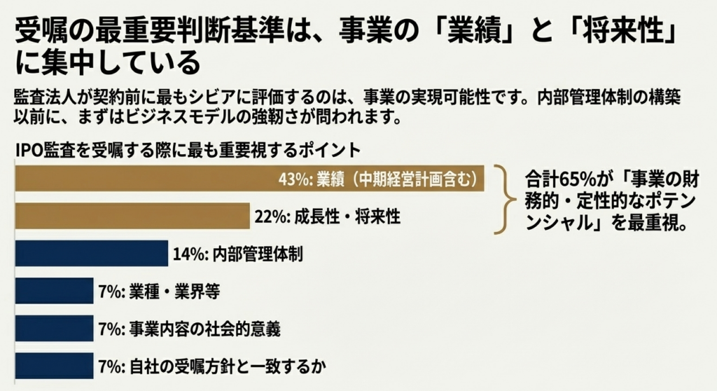 監査法人は単に数字をチェックするだけでなく、経営者の誠実性やガバナンス意識、そして将来の成長ストーリーを厳格に評価します。実際、監査法人への調査(ソース資料Ⅳ)では、受嘱時に「業績(43%)」のみならず、「成長性・将来性(22%)」や「経営者の誠実性」を極めて重視しているという結果が出ています。