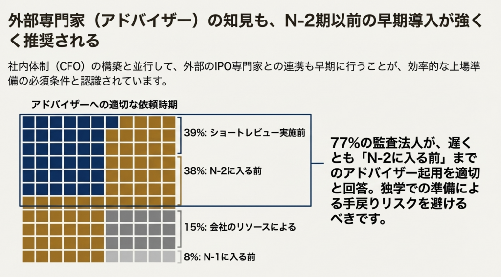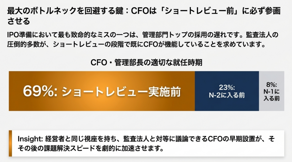 アンケート調査によれば、69%の監査法人が「CFO・管理部長はショートレビュー実施前に就任すべき」と回答しています。専門性の高い人材は「上場が決まってから」では確保できません。 - アドバイザーとの早期連携
