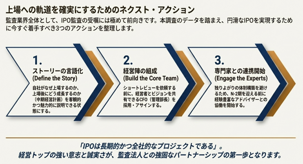 最短かつ確実にこの状態に到達するための実務指針は、「早期のアドバイザー関与」と「適切なタイミングでの準金商法監査契約」の組み合わせに尽きます。