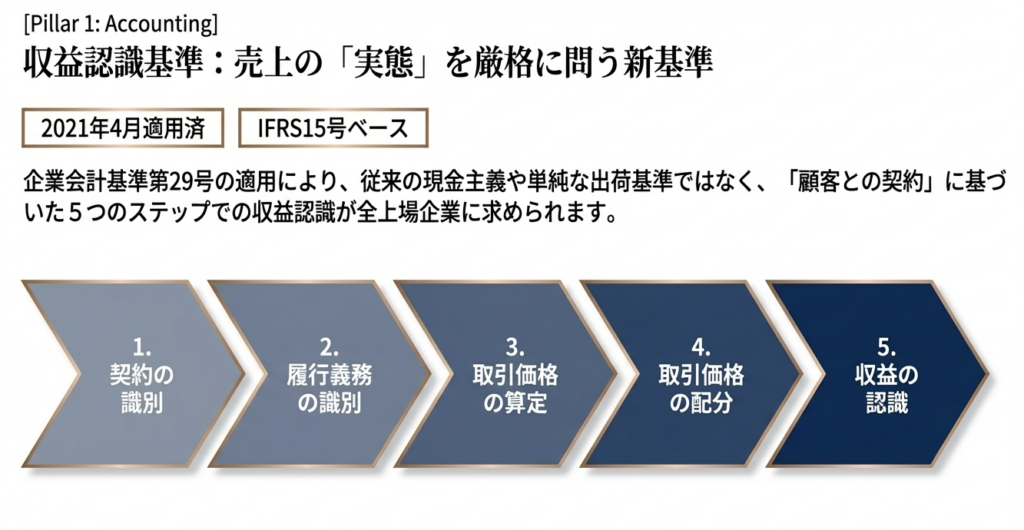 2021年4月から適用された「5ステップアプローチ」は、単なる仕訳の変更ではありません。特に出荷基準から検収基準への変更や、「本人か代理人か」という総額・純額の判断は、売上高というKPIを根本から変える可能性があります。
