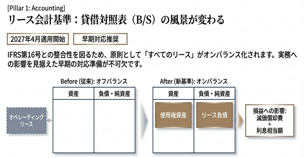 収益認識会計基準(5ステップアプローチ)の適用は、契約書の精査や基幹システムの見直しを迫ります。さらに、2027年4月以降適用予定の「リースに関する会計基準」は、原則としてすべてのリース資産のオンバランス化を求めるため、N-2期を迎える企業にとって新たな戦略的リスクとなります。 - 手戻りのコスト: