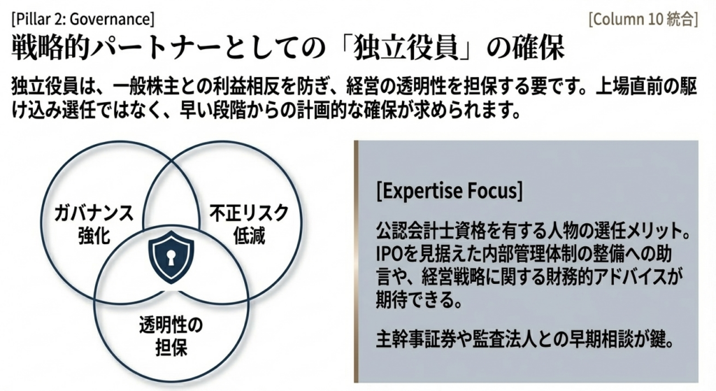 審査において、経営陣が創業メンバーのみの同質な集団である場合、「チェック&バランスが機能し、多様な視点で事業計画の妥当性を評価できているか」が厳しく問われます。Column 10でも触れられていますが、独立社外取締役に公認会計士を選任することは、財務的アドバイスを得るだけでなく、経営の健全性を投資家に証明する強力なシグナルとなります。