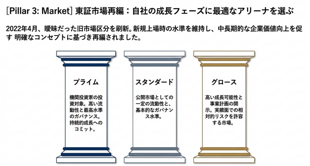 グローバル投資家の視線に耐えうる「プライム」、基本的なガバナンスを重視する「スタンダード」、高い成長可能性を追求する「グロース」と、求める水準が異なります。