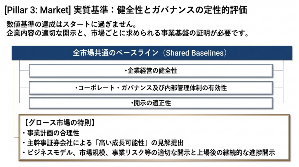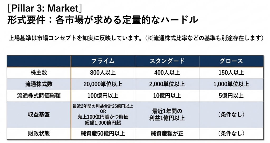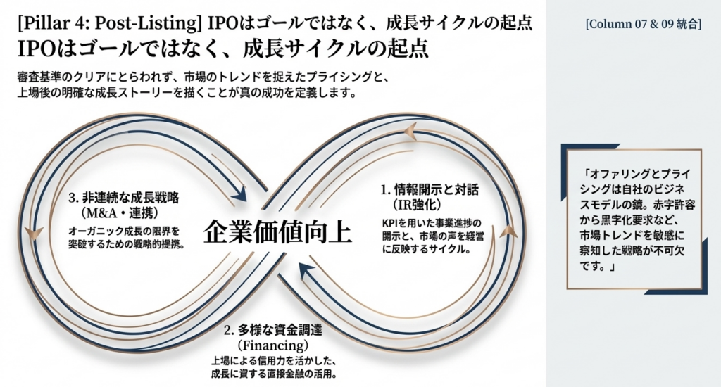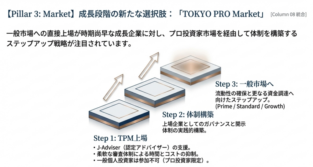 Column 08 にある通り、TPMはJ-Adviserの支援による早期上場が可能です。これを「戦略的なトレーニング期間」と捉え、一般市場(グロース等)へのステップアップを見据えた実績作りの場として活用する企業が増えています。流動性の低さは課題ですが、まずは「上場会社」としてのブランドと管理体制を確立するメリットは無視できません。