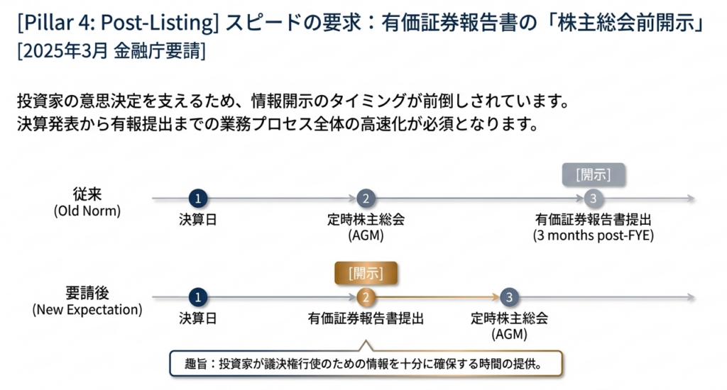 投資家が議決権行使前に検討する時間を確保するため、株主総会前の開示が強く求められています。これは事実上、従来の決算スケジュールを2〜3週間短縮することを意味します。