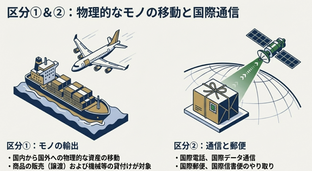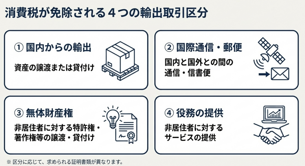 どの取引が免税対象となるかは、法律で厳格に定められています。実務上、特に役務提供の判定ミスは税務調査での「定番の指摘事項」であるため、以下の4区分を正確に理解する必要があります。