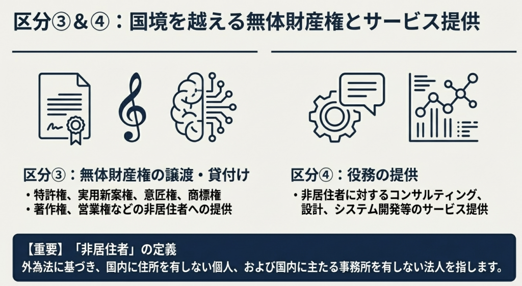 非居住者に対して行われる、鉱業権、工業所有権、著作権、営業権といった無体財産権の譲渡または貸付けが対象となります。これらは物理的な資産の輸出と同様に、免税取引の範囲に含まれます。