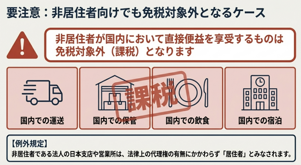 ここが実務上の最重要局面です。非居住者(※)に対するサービス提供は原則免税ですが、「国内で直接便益を享受するもの」は免税の対象外(10%課税)となります。