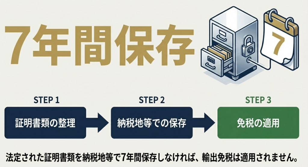 輸出取引等の区分に応じて、輸出許可書、税関長の証明書、または輸出の事実を記載した帳簿や書類を整理し、納税地等に7年間保存する必要があります。